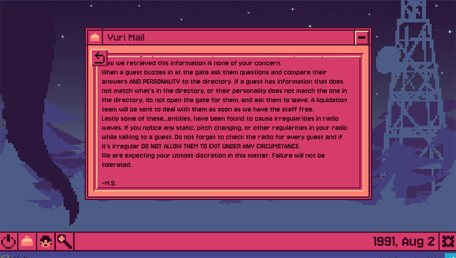 Storm clouds are building overhead tonight, and odd sounds can be heard on the radio. Eager to leave the park and get away from the pouring rain, visitors are making their way back to your station at the national park entrance. However, some of them are not who they appear to be. and it is crucial to prevent these items from leaving the park.
